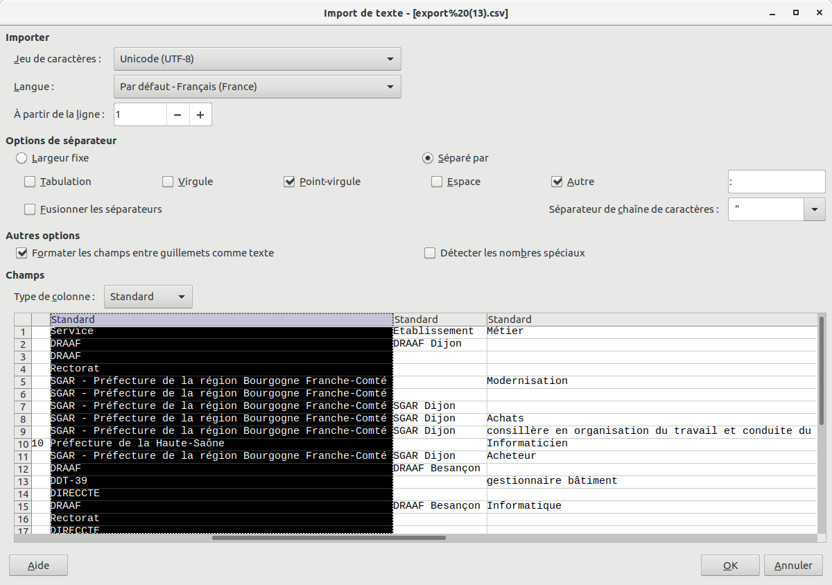Ok c'est le pb avec Excel, par défaut il importe les données sous format Windows - ANSI (si on ouvre directement le fichier sans passer par l'import), sinon il propose d'importer les données texte toujours par défaut sous format Windows - ANSI. Cela relève donc du tuto pour ouverture sous Excel. Pour Calc, pour une fois, c'est plus transparent (options d'ouverture plus explicites). Donc pas de modifs à faire de ton côté - merci