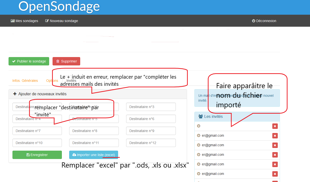 Ci-joint une copie d'écran liée aux invitations dans Open Sondage avec des propositions de renommage.