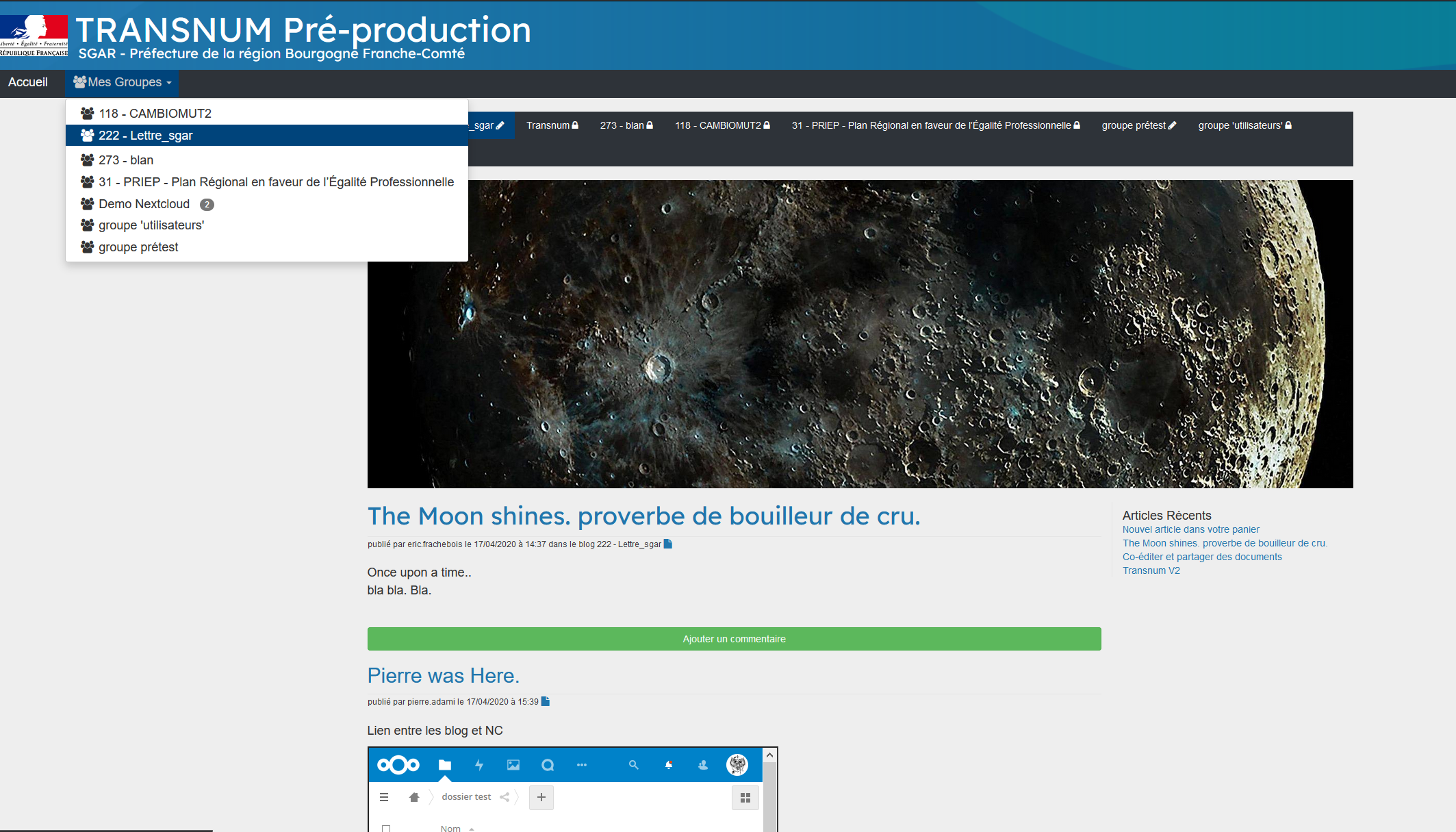 Même constat pour le blog, de fait. Il faut repasser par la nav "Mes groupes/sélectionner son groupe" pour retourner sur la page d'accueil du groupe d'origine.