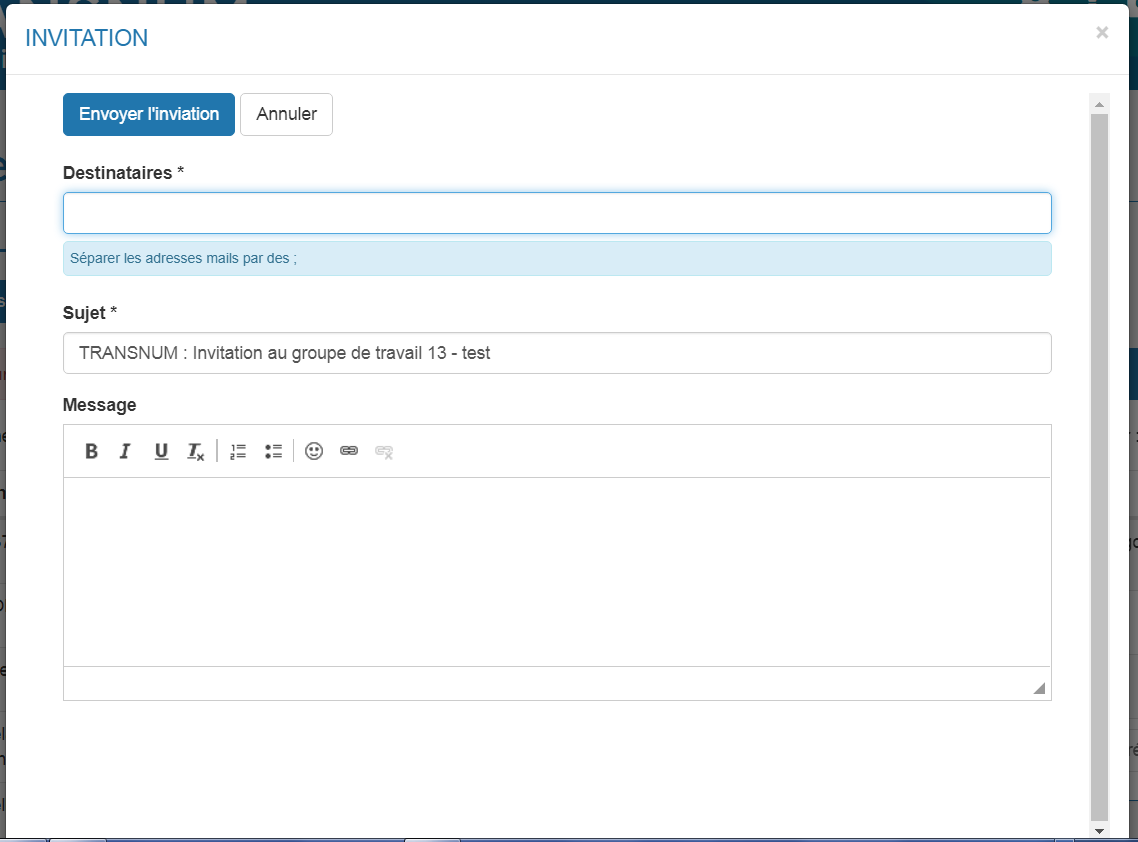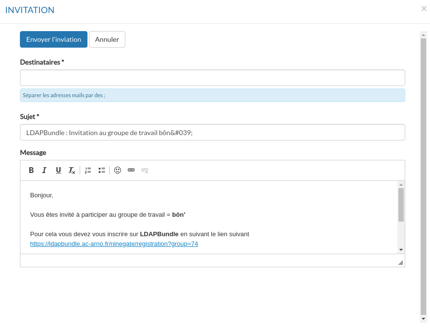 L'utilisateur peut modifier le texte et saisir une liste de mails séparés par des ;