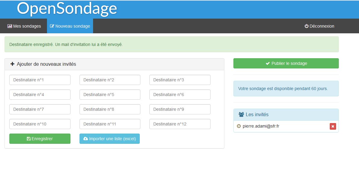 Point 4 : C'est bien cela, je ne l'avais pas publié. J'avais fait le même oubli pour les sondages privés. Après l'enregistrement des invités et malgré la non-publication le message suivant apparaît "Destinataire enregistré. Un mail d'invitation lui a été envoyé" (cf.copie d'écran). En lisant cela je ne pense pas à publier. Ce terme "publier" est coutumier pour les informaticiens mais pas forcément pour les utilisateurs. Est-il possible de remplacer le terme "Publier le sondage" par "Lancer le sondage".